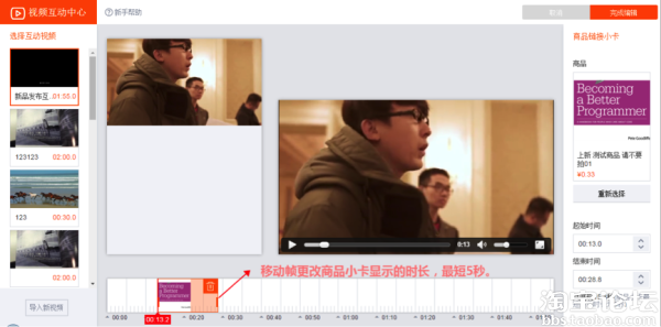 5、拖动帧可以更改商品显示的时长,为保证观看者可阅读性,商品显示时长最短至少5秒