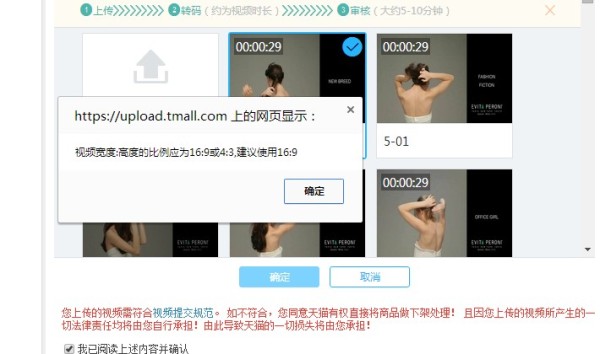 亲,请确认你的视频分辨率是否是16:9? 比如下面的例子就不是。目前视频尺寸要求比较苛刻,我们已经在优化中,此限制会预计5月中心会去掉。
