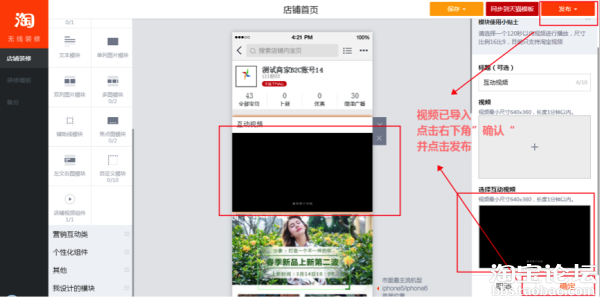 1、进入无线店铺首页装修后台:无线运营中心-装修,点击插入视频模块,点击右小角”选择互动视频”