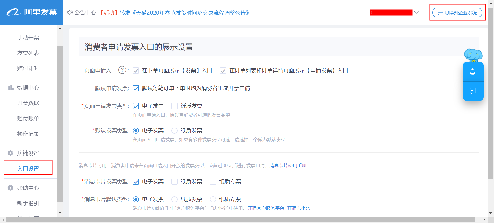 如您使用的是阿里官方电子发票开票工具(订购方式点此查看),在消费者下单申请电子发票后,设置系统自动开票(针对天猫、淘宝订单),您可以通过【天猫商家中心>店铺管理>发票管理】进入阿里发票后台,左侧选择【店铺设置-入口设置】,右上角选择【切换企业系统】,步骤截图如下。更多后台操作流程请您点此查看。