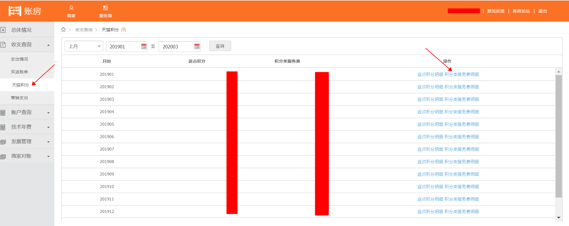 3、帐单明细:进入【商家中心-账房-收支查询-天猫积分】,选择对应月份右侧的【积分类服务费明细】进行下载即可。