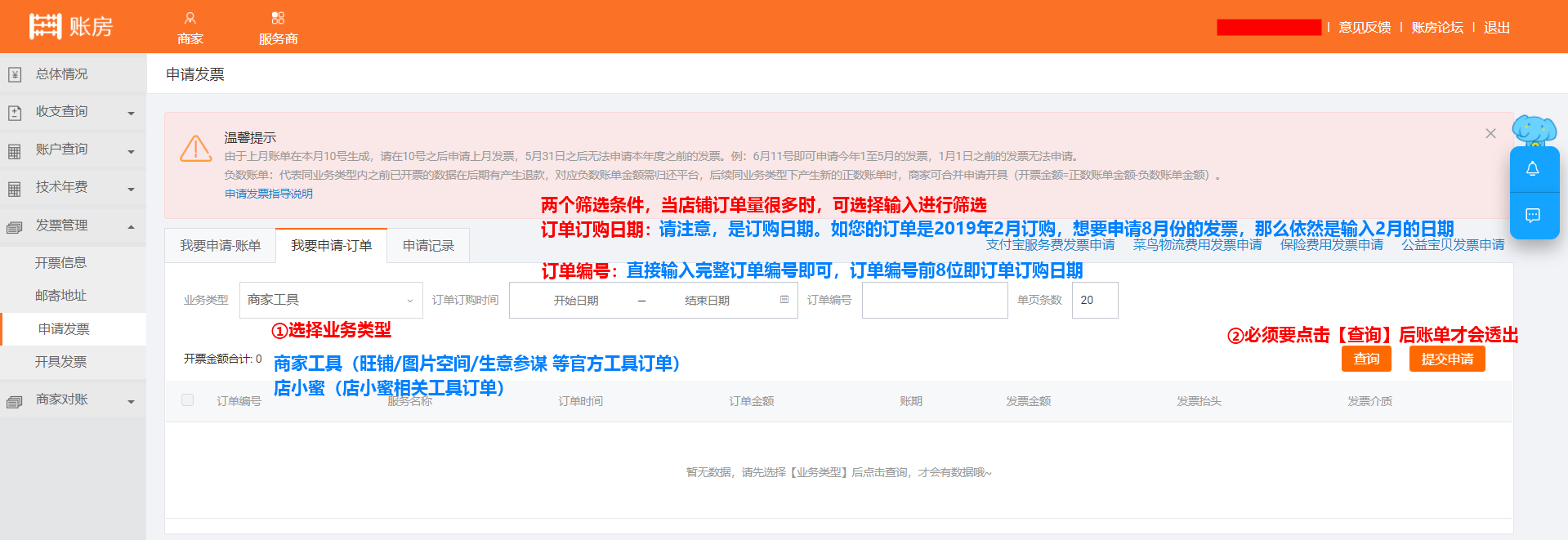 淘宝旺铺发票申请路径:【账房】-【发票管理】-【申请发票】-【我要申请-订单】,