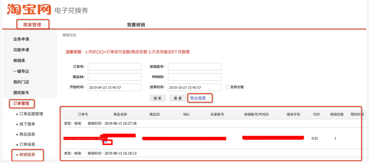 温馨提示:电子凭证管理-我要核销-核销管理,只能导出对应登录账号的核销订单报表,无法直接导出全部的核销订单,即:A子账号导出的只有A子账号核销的订单报表,非店铺全部的核销报表。