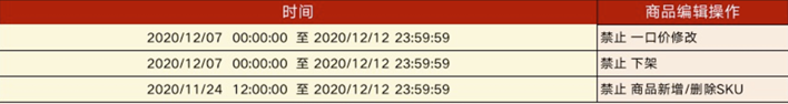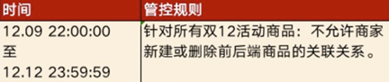 强烈建议:双十二活动商家在12月5日0点前维护好库存,包括走后端货品库存,防止双12当日更新库存错误操作导致发生超卖;其中走供应链及菜鸟仓的库存高峰期(follow以上时间段)同样是禁止更新。
