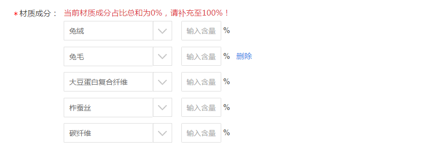 目前材质成分属性最多填写5个,若您的材质成分多于5个,则两种及以上含量各≤5%的纤维且其总量≤15%时,可集中标为“其他纤维”,您可以将总量≤15%的多种材质合并为“其他纤维”。填写时需要将整体成分含量总和为100%,相关材质属性填写规范点击查看编辑商品属性选择入口: