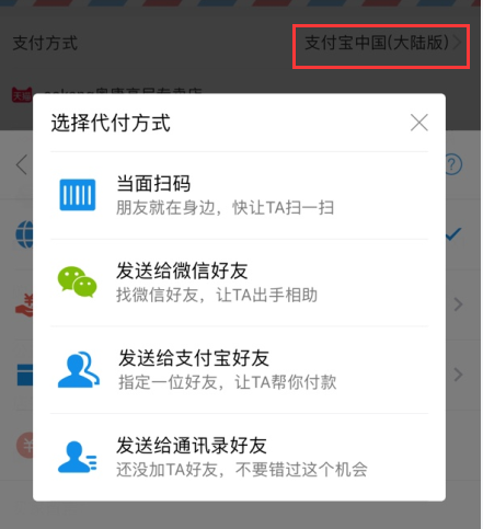 如需使用代付功能,建议消费者更换支付方式为支付宝中国(大陆版):