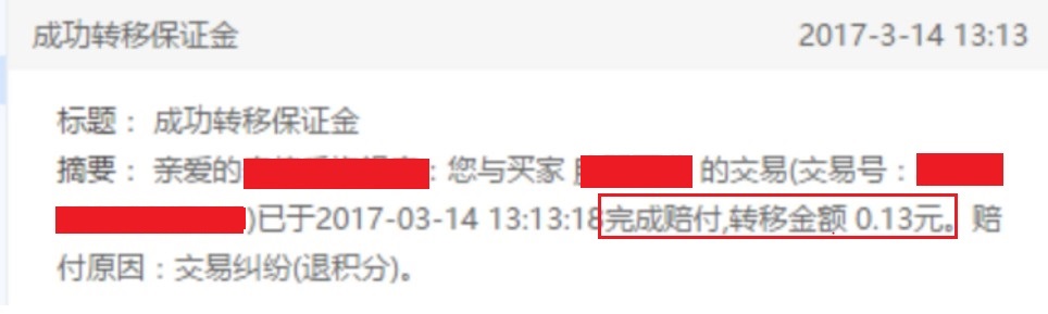 1、交易成功后,若买家申请全额退款,积分会全部退还给买家(退回积分到买家的积分账户),同时您同意退款操作后,会收到系统消息提示(如下图),这里说的赔付其实就是把积分退给买家的意思,并不会额外多扣您的钱款哦。