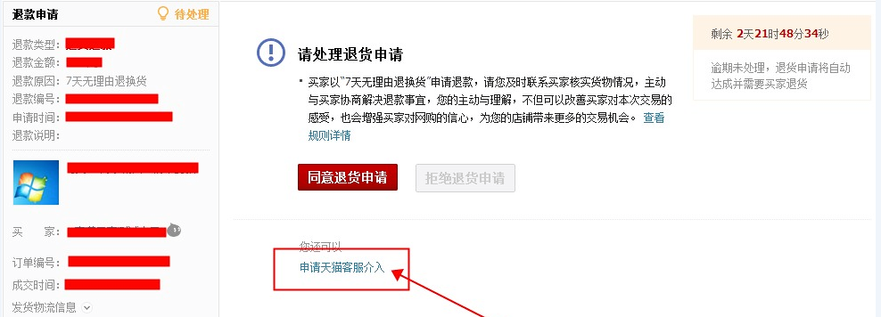 亲,如果商家想要申请小二介入处理,必须是 退款拒绝状态下才能申请,其他状态下无法申请,交易关闭状态下也无法申请。您直接点击"申请天猫客服介入"按钮即可(如下图)。目前针对“售中-卖家已发货-未收到货-仅退款”场景下,买家发起退款3天后,且退款为卖家已拒绝状态,买卖双方才可以点击申请客服介入,否则页面会报错哦(以下类目除外:虚拟类目、众筹、鲜花速递/花卉仿真/绿植园艺、处方药、平行进口车、水产肉类/新鲜蔬果/熟食)