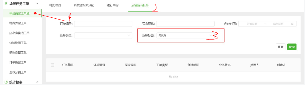 ② 点击进入千牛售后服务平台——平台商家工单通——业务标签选择无忧购,如下图,可查看所有进行中的工单,请您在工单超时前主动联系消费者处理。直达链接点此,操作教程详见