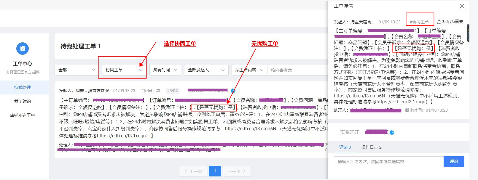 ① 天猫无忧购“一键售后”工单处理平台,商家可以点此直达处理,找到协同工单 ,处理内容中会有无忧购字样,如下图。