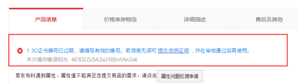 亲,该提示表示宝贝填写的3C认证编号状态已过期提示:您可以通过国家3C官网信息查询证书的状态,若证书无效,则无法在发布商品页面使用若国家3C官网查询证书状态有效,请您通过淘宝百科查询证书,请点击右上角“申请修改”将证书状态更新成有效后关注3个工作日审核即可温馨提示:若淘宝百科没有该3C信息,国家3C官网刚有收录该3C认证号信息,您可以通过快速入口提交,系统2个小时自动匹配国家库,若国家库还没有返回数据匹配校验不上,建议您再通过以上教程中的百科提交人工审核,认证方式点此查看