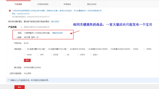 例如下图类目报错截图中:该类目下,类目、品牌、型号是关键属性,故相同类目+相同品牌+相同型号的商品,一家天猫店只能发布一个。