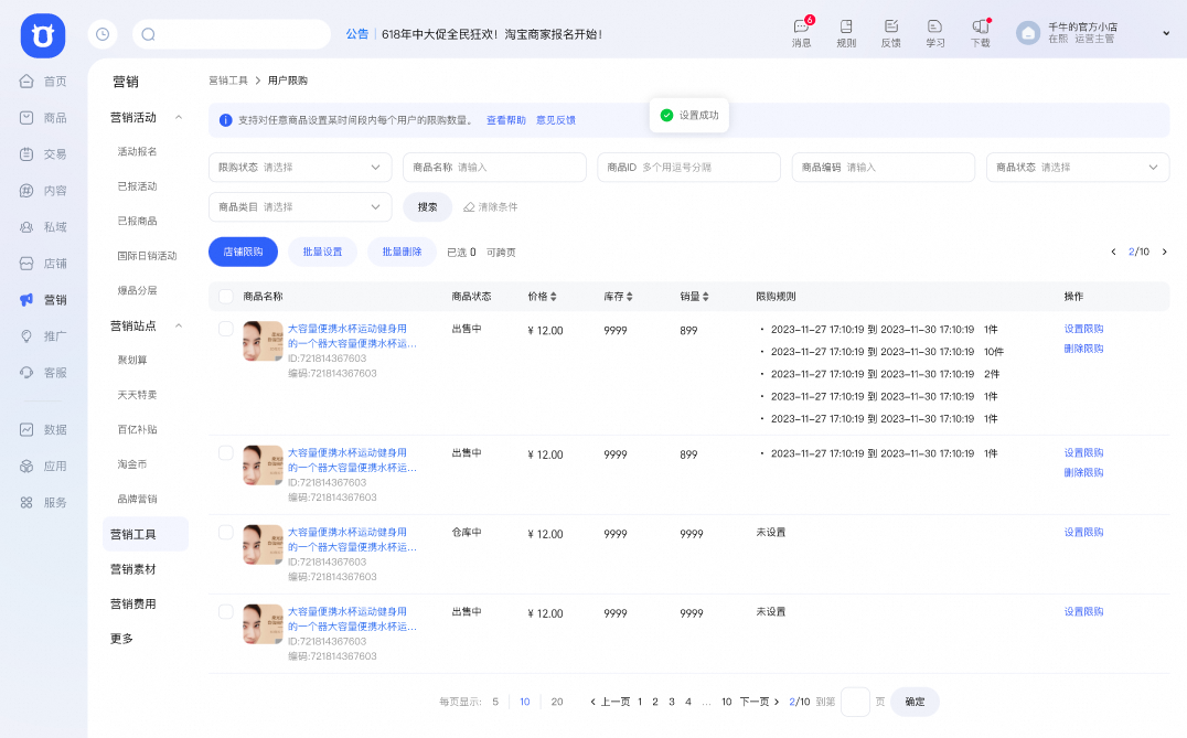 选定要设置限购的商品 > 点击“用户限购” > 设置限购(每个用户限购几件、限购时段)>查看设置结果“设置成功”