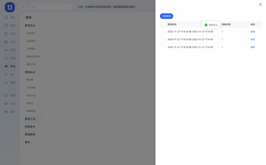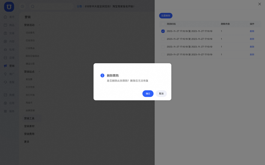 选定要设置限购的商品 > 点击“删除限购” >>删除确认>查看取消结果