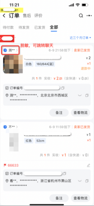 1、商家端不可见买家昵称,买家昵称脱敏为“首字**”(例:“买家123” 脱敏为:买**)