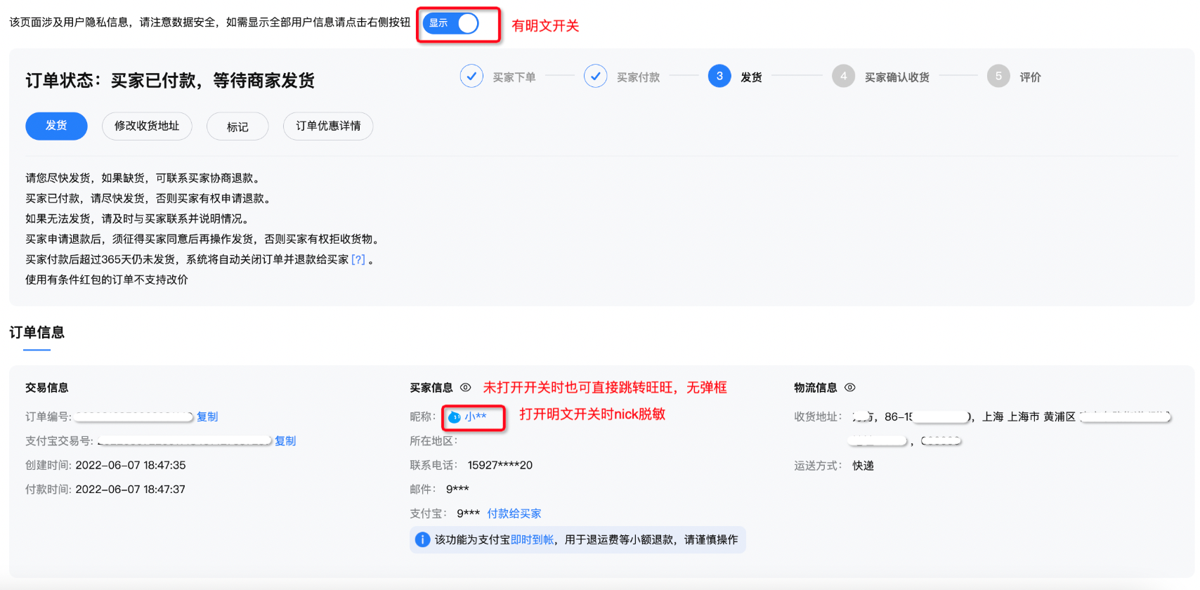 有隐藏开关,但买家昵称不会显示,仅对收货地址有效,不影响旺旺点击唤起聊天窗口(注:近3个月订单详情看不到会员名;3个月前订单详情目前还可以看到会员名,后续也会脱敏)
