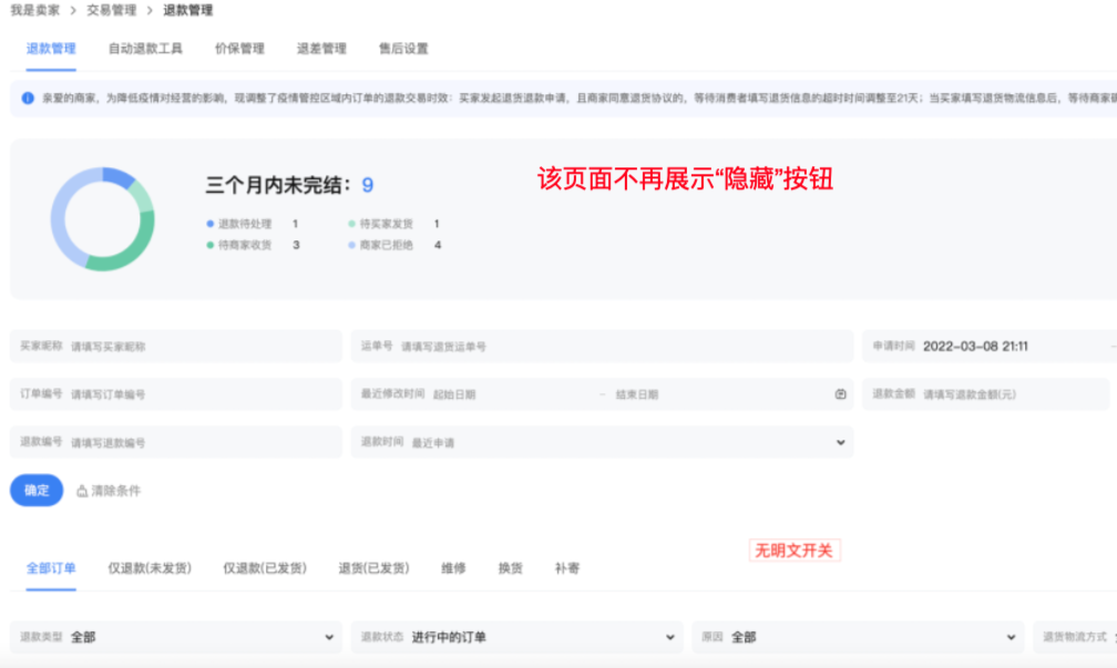订单列表、退款列表、退款详情:【隐藏】按钮不再展示