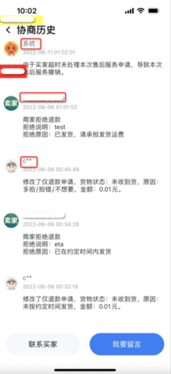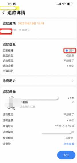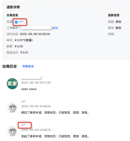 会员名脱敏且顶部无隐藏开关、旺旺可直接点击唤起聊天窗口,协商历史处买家昵称脱敏