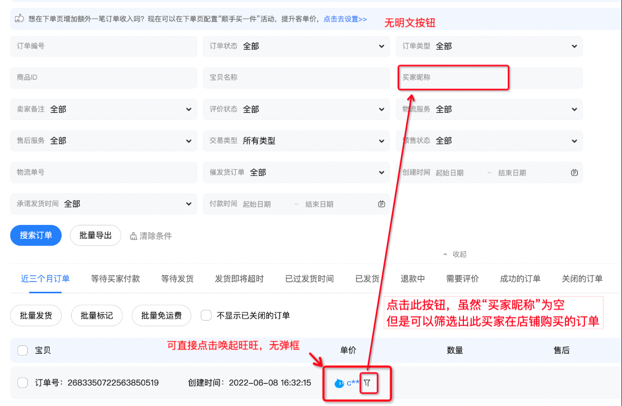 买家昵称脱敏,可唤起旺旺;点击买家信息处的近三个月订单按钮,可以正确筛出该买家的近三月订单